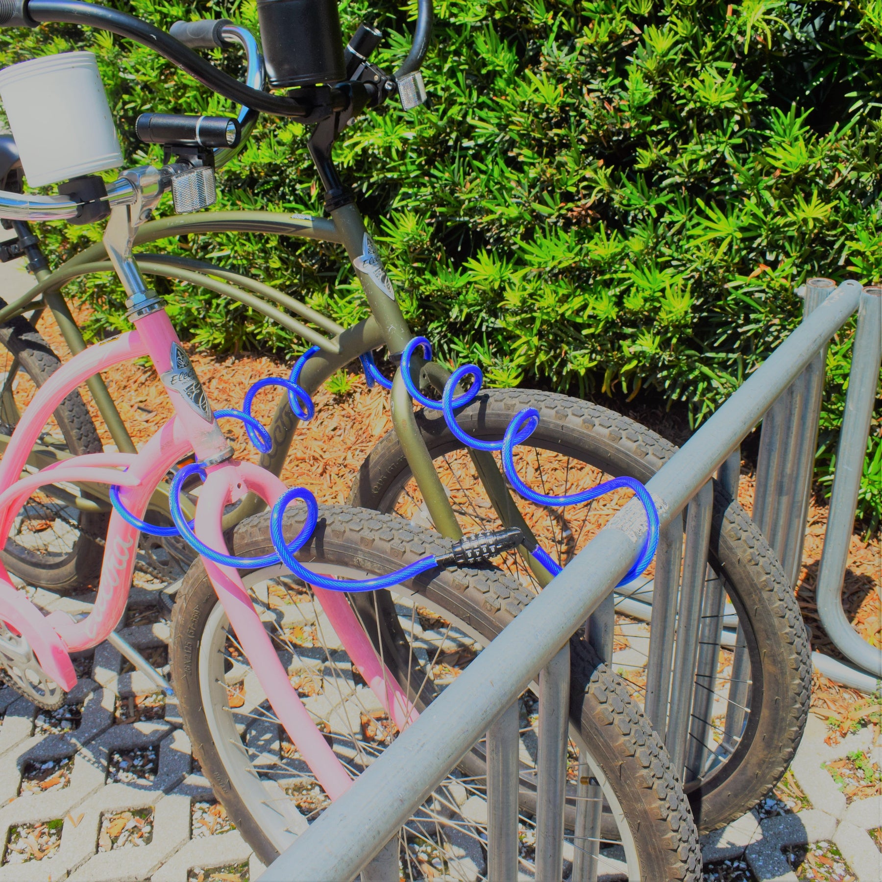 • EASY TO USE AND COMPACT. Key-less convenience - choose your own 4-digit code with the re-settable combination lock. The cable is coiled which allows for easy storage and prevents excess cable from dragging.