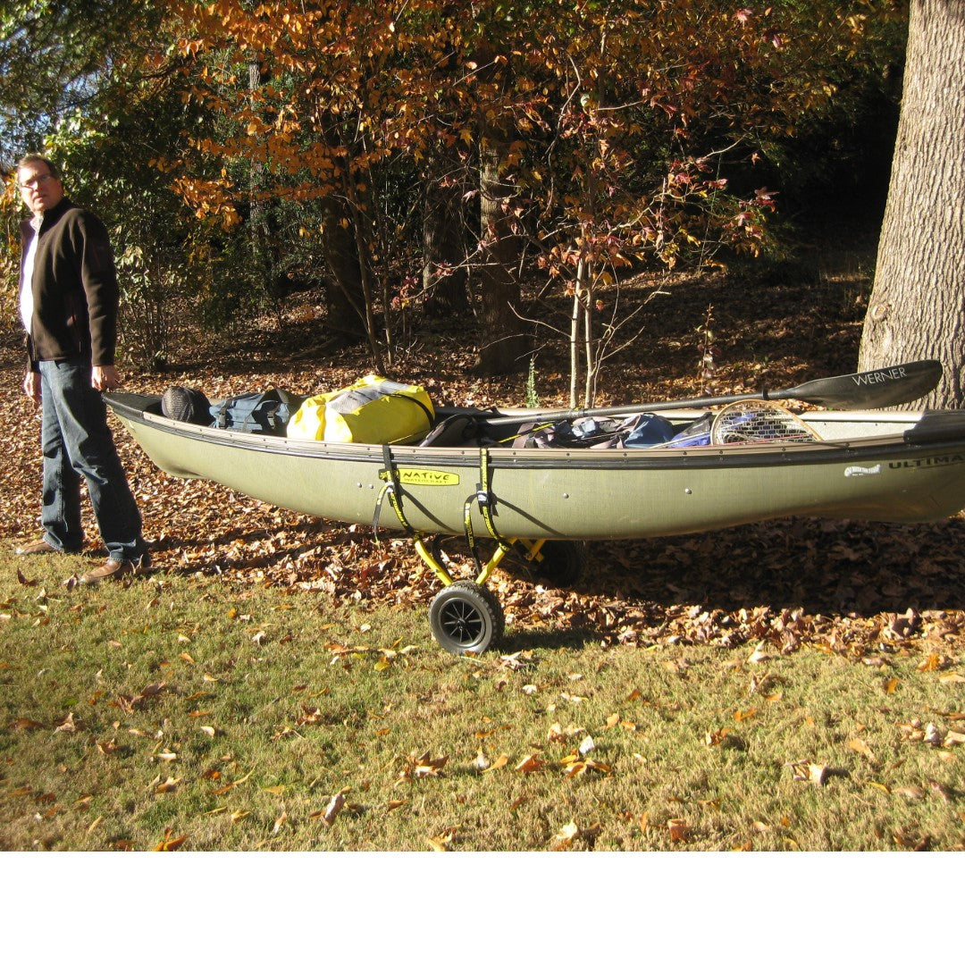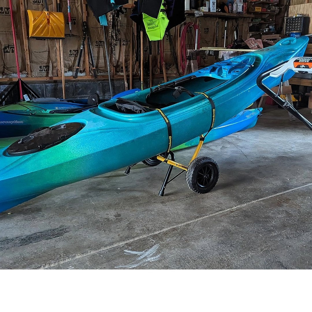 Easily handle heavier loads with oversized tubing & arched axle on this heavy-duty kayak and canoe cart. Simplify securing your boat with strategically positioned cam buckles.