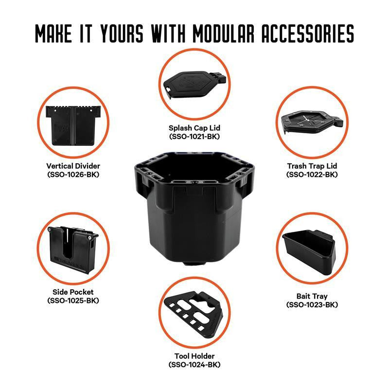 Modular platform supports multiple add-on accessories, including Bait Tray, Tool Holder, Side Pocket, Vertical Dividers, Splash Cap Lid, and Trash Trap Lid
